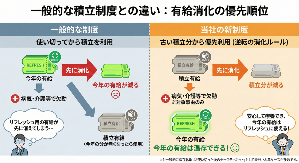 多くの企業で導入されている積立制度は「今年の有給休暇を全て使い切った後のセーフティネット」として設計されているのが一般的です。そのため、病気で長期間休むと、本来リフレッシュのために使うはずだった今年の有給休暇が先に消滅してしまうという課題がありました。そこで当社は優先順位を逆転させ、対象事由(病気・介護等)であれば、「今年の有給休暇」を残したまま、「積立有給(古い休暇)」から先に消化できる仕組みを採用しました。