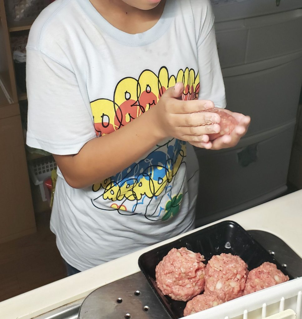 ほどよく混ざりあったところで、タネを丸め人数分にわける。両手の間でキャッチボールして、徐々に伸ばしていく。