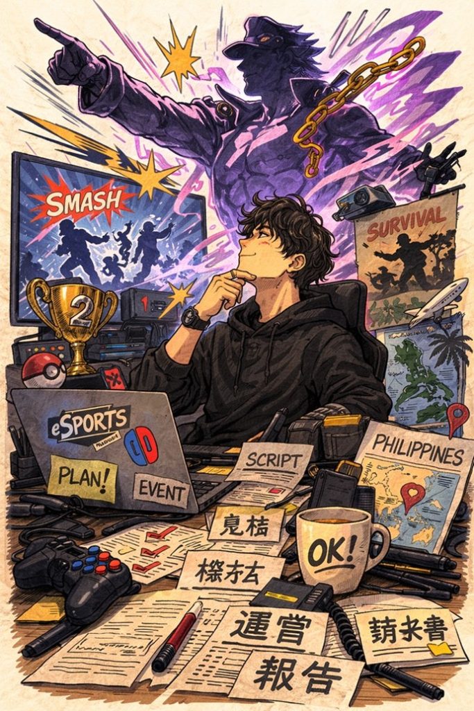 ヤマケンさん(27歳/5年目)は、ひと言で言うと「説明が長い、でも筋は通ってる」タイプ。イベントの企画、台本、機材、見積、現場運営、報告書、請求書まで——eスポーツ周りの何でも屋を、実質2人体制で回している。そりゃ語りたくもなる。